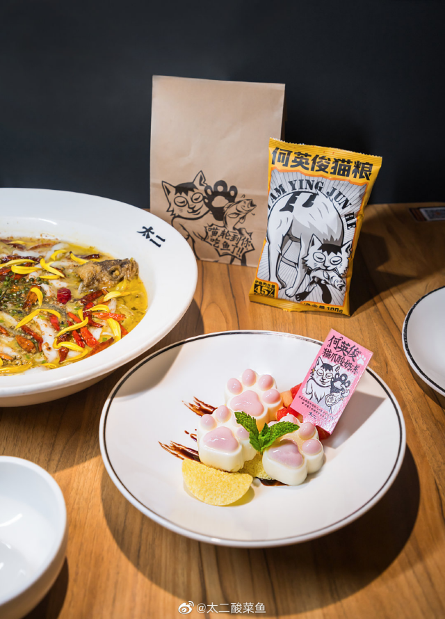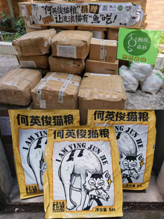 太二酸菜鱼做鱼只取鲈鱼精华部分,每天还有许多没用到的鱼骨鱼肉,以这些没用到的鲈鱼肉骨作为45%的主原料,并加入猫咪必需的营养成分制作成“何英俊猫粮”。呼吁大家吃完鱼,随手带走一袋公益猫粮,让流浪猫也能吃上“鱼”。也由此,诞生了"何英俊公益"项目。
