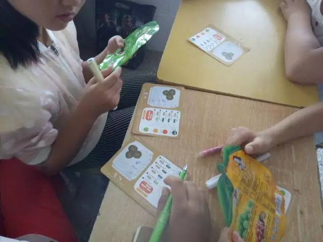 素拓正式开始,九个小组各自在组长的带领和助教老师的指导下,按照“零食揭秘卡”的指示,一步一步认真地完成揭秘卡上的任务,为搜集到的零食袋子打上分数,分别为0分、50分、70分或者90分。小组活动结束后,每个小组由组长作为代表,将本组打好分数的零食袋子贴到了黑板上零食海报的相应位置处。